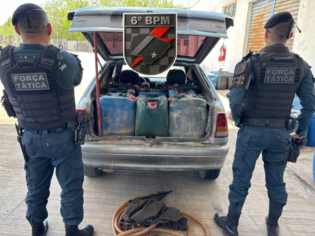 A equipe da Força Tática, em operação preventiva na região de fronteira, abordou um veículo que trafegava em alta velocidade. Durante a vistoria, foram encontrados 13 galões de 50 litros, totalizando aproximadamente 650 litros de combustível (diesel) transportados sem autorização legal.