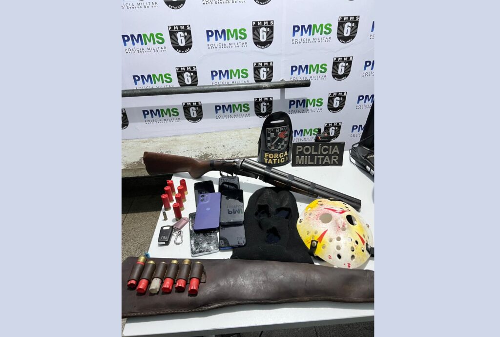 Durante buscas no alojamento foram localizadas a espingarda utilizada na ameaça, diversas munições calibre 12, além de uma munição calibre .38. Também foram encontradas no veículo uma balaclava de cor preta e outras munições calibre 12.