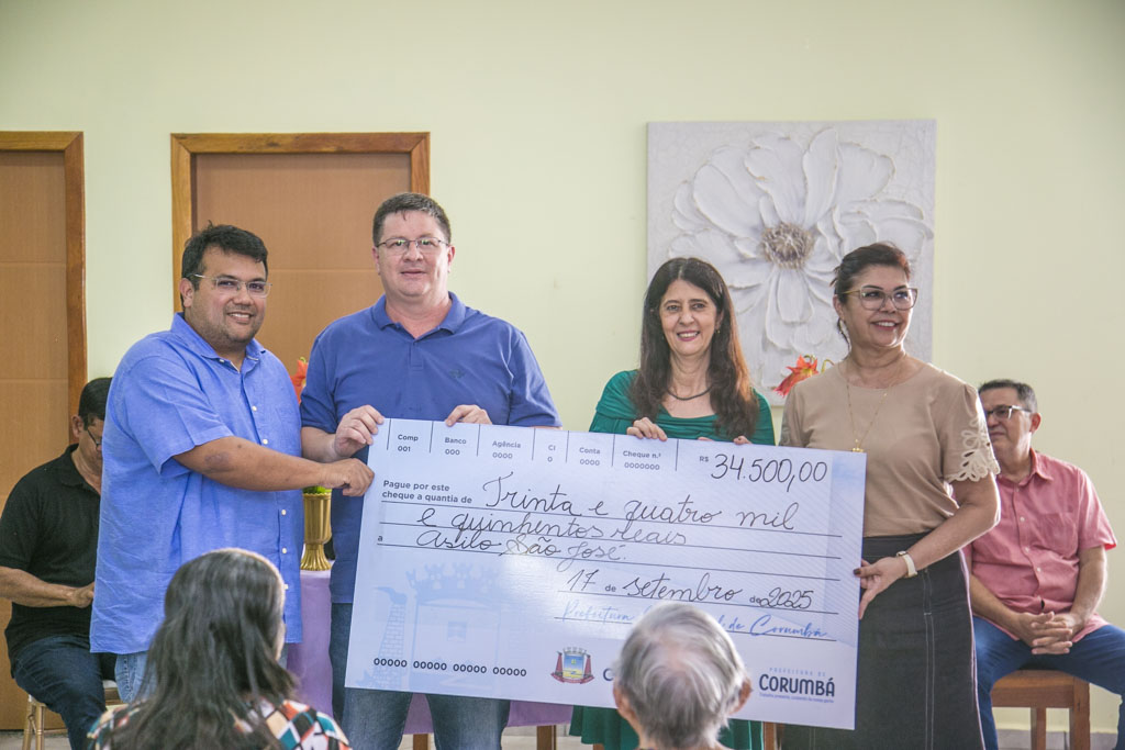 A Prefeitura de Corumbá repassou R$ 74.500,00 à Liga das Senhoras Católicas da Diocese de Corumbá, responsável pelo Asilo São José, em solenidade realizada na tarde desta quarta-feira, 17 de setembro, na sede da entidade, na área central da cidade. A entrega contou com a presença do prefeito Dr. Gabriel Alves de Oliveira e da vice-prefeita e secretária municipal de Assistência Social e Cidadania, Bia Cavassa. A ação integra as comemorações pelos 247 anos de fundação de Corumbá.