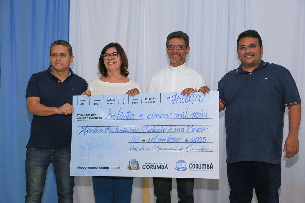 A Prefeitura de Corumbá repassou, nesta sexta-feira, 12 de setembro, o valor de R$ 105 mil à Missão Salesiana Cidade Dom Bosco, em solenidade realizada na sede do Programa Criança e Adolescente Feliz (PCAF). A entrega foi feita pelo prefeito, Dr. Gabriel Alves de Oliveira, e pela vice-prefeita e secretária de Assistência Social e Cidadania, Bia Cavassa. Também participaram da agenda os vereadores Hanna Santana e Alexandre Vasconcellos, o deputado estadual Paulo Duarte, o superintendente de Políticas Públicas, William Duarte, e o gerente da Juventude, Paulo Leones.