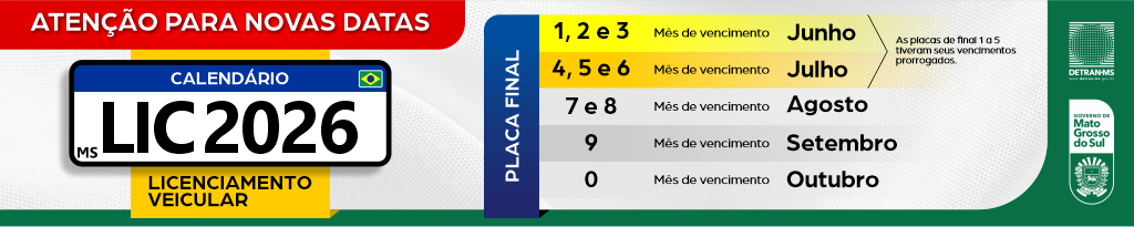 O Departamento Estadual de Trânsito de Mato Grosso do Sul (Detran-MS) publicou, na edição desta segunda-feira (13) do Diário Oficial do Estado, a Portaria nº 209/2026, que altera o calendário anual de licenciamento de veículos para o exercício de 2026.