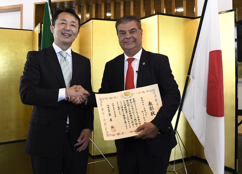 O parlamentar recebeu o Diploma de Honra ao Mérito do Ministro dos Negócios Estrangeiros do Japão, distinção concedida pelo governo japonês e entregue pelo embaixador Teiji Hayashi, em reconhecimento às suas contribuições para o fortalecimento das relações entre Brasil e Japão.