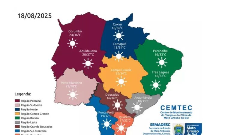 Mato Grosso do Sul deve registrar mais um dia de tempo seco e quente. A previsão desta segunda-feira (18) indica que a máxima pode alcançar os 38°C, com desta que para a região pantaneira e sudoeste.