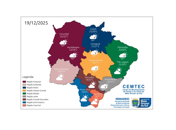 No sul, cone-sul e Grande Dourados, as mínimas serão de 18°C, com máximas de 32°C. Já nas regiões pantaneira e sudoeste, os termômetros terão variação entre 23°C e 35°C.