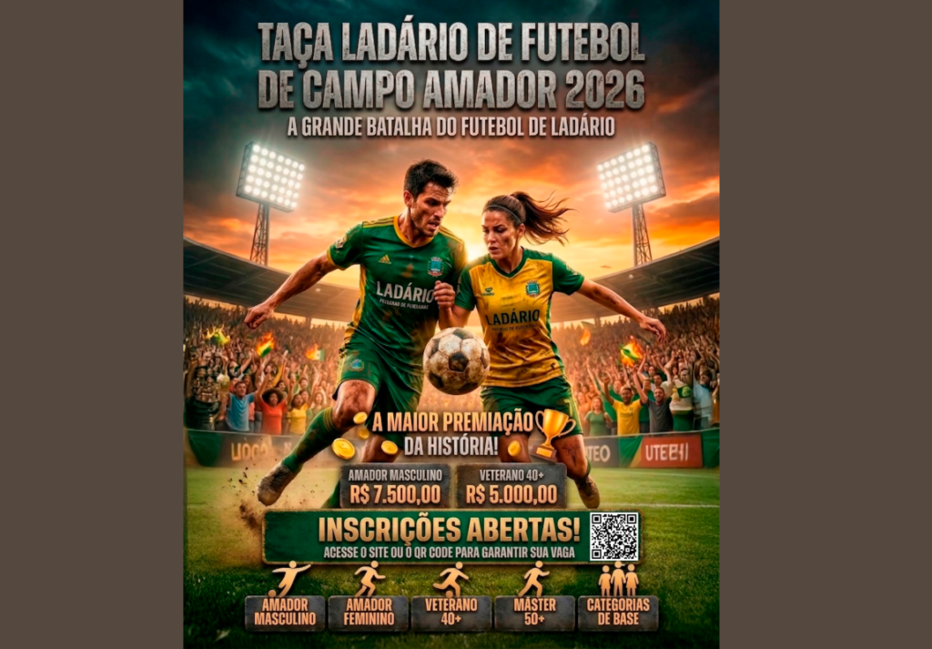 A Prefeitura de Ladário informa que estão abertas as inscrições para a Taça Ladário de Futebol de Campo Amador 2026, competição que promete movimentar o esporte local com diversas categorias e premiação histórica.